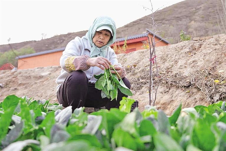 沈家河版畫(huà)創(chuàng)作者李麗榮在自家門(mén)前的菜地里摘菜。記者 郭小立 攝