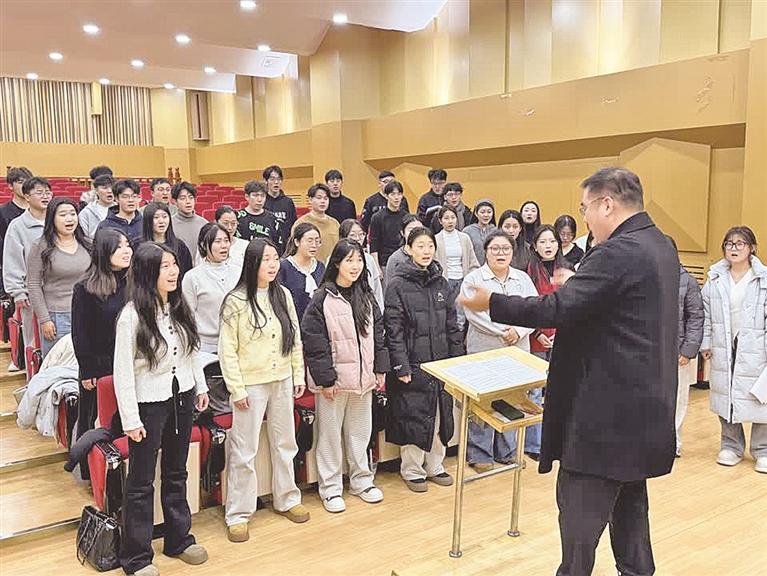 為保障排練,合唱團申請將排練時間由21時提前至19時30分?!澳銈兪窃邸濉南M≈还馨残呐啪?!”所有任課老師們都主動幫同學們調整上課時間。