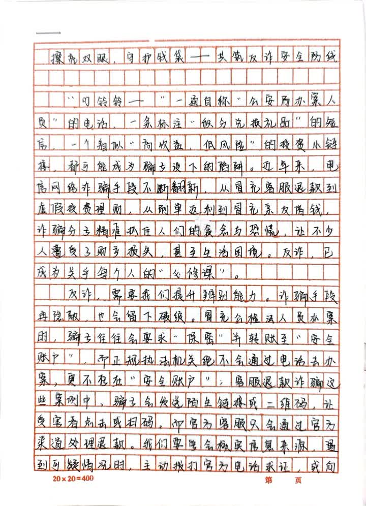 此次評選的優(yōu)秀作品均主題鮮明、創(chuàng)意十足,充分展現(xiàn)了寧夏職業(yè)技術(shù)大學(xué)學(xué)子的才華與對反詐的深刻理解。同時,通過“手寫反詐”的實踐方式,讓抽象的反詐知識轉(zhuǎn)化為具象的文字思考,有效提升了學(xué)生們的防騙意識和應(yīng)變能力,形成了“創(chuàng)作、傳播、再創(chuàng)作”的良性循環(huán)。目前,這些承載著反詐智慧的作品已匯編成冊,在校園安全教育專欄進行長期展示。