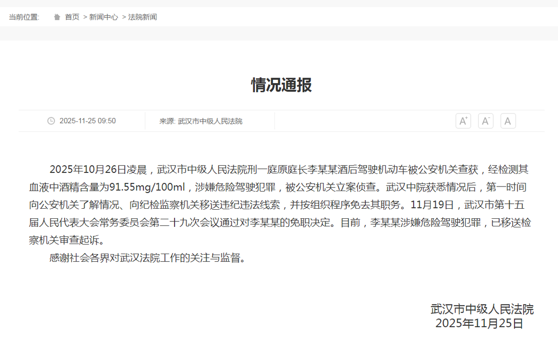 2025年10月26日凌晨,武漢市中級人民法院刑一庭原庭長李某某酒后駕駛機動車被公安機關(guān)查獲,經(jīng)檢測其血液中酒精含量為91.55mg/100ml,涉嫌危險駕駛犯罪,被公安機關(guān)立案偵查。