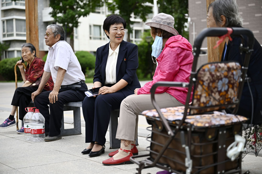 ??6月20日,寧夏銀川市金鳳區(qū)長城花園社區(qū)黨委書記趙耐香(左三)在社區(qū)廣場與居民交流。