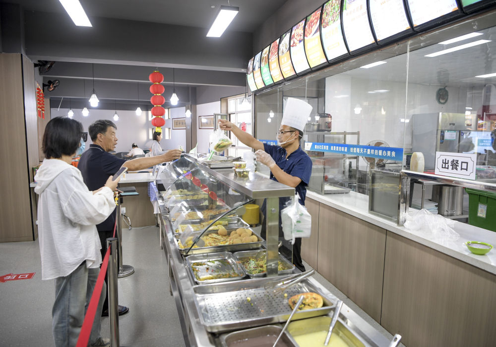??6月20日,寧夏銀川市金鳳區(qū)長城花園社區(qū)居民在社區(qū)食堂買早餐。